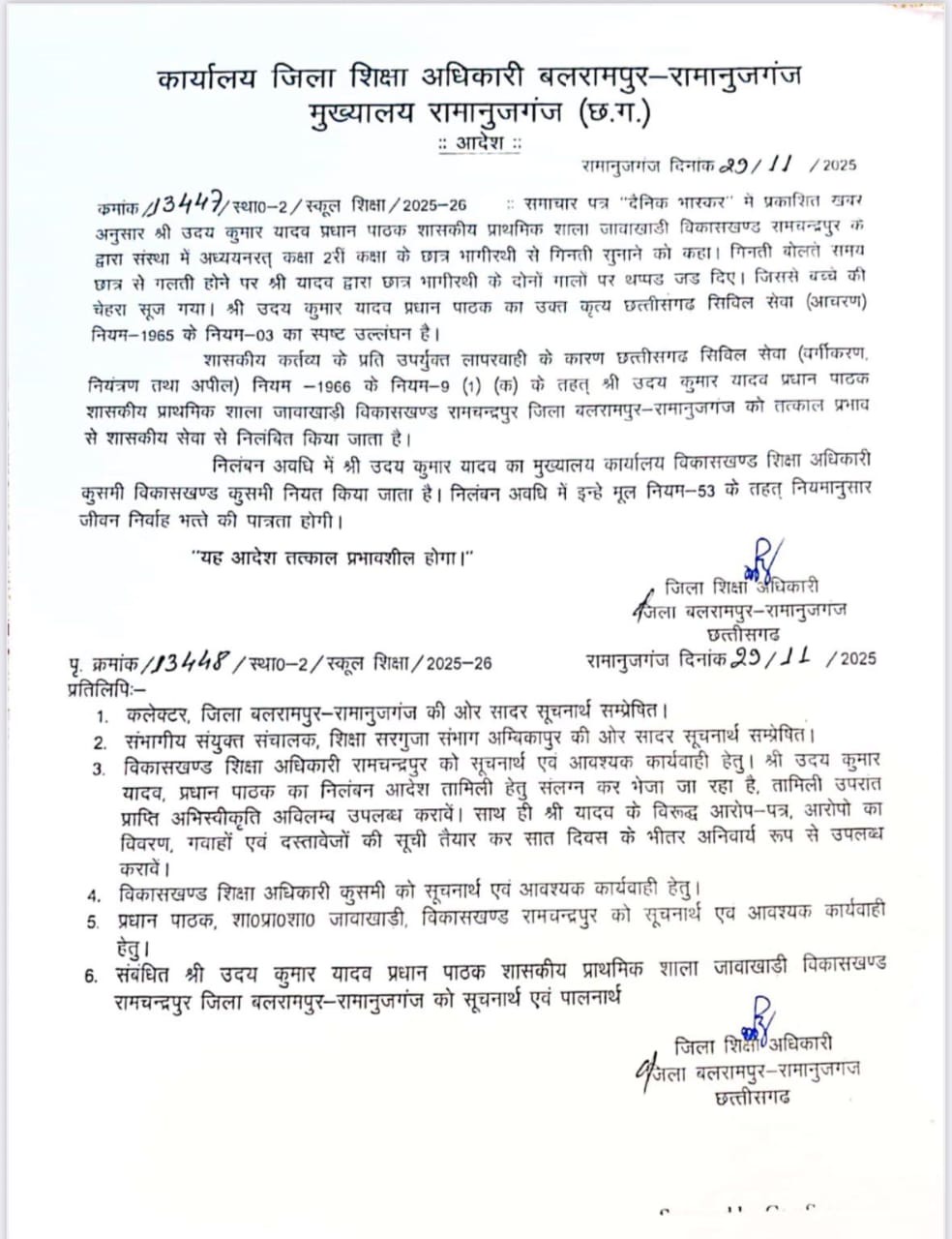 मामले को गंभीरता से लेते हुए जिला शिक्षा अधिकारी मनीराम यादव ने प्रधान पाठक उदय यादव को निलंबित कर दिया है। डीईओ ने बताया किशिक्षक के विरुद्ध अपराध दर्ज कराने बीईओ को थाने भेजा गया था। त्रिकुंडा थाना प्रभारी जवाहर तिर्की ने भी कार्रवाई की पुष्टि की है। प्रधान पाठकको छत्तीसगढ़ सिविल सेवा नियम 1966 के नियम 9(1)(क) के तहत निलंबित किया गया है। घटना से क्षेत्र में आक्रोश व्याप्त है और अभिभावकों नेशिक्षा विभाग से कड़े कदम उठाने की मांग की है।