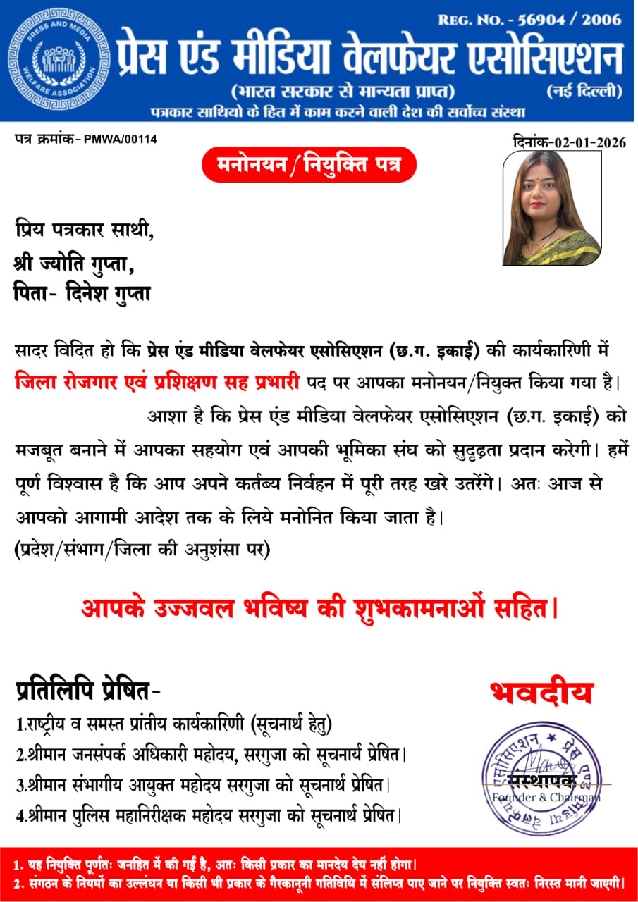 अंबिकापुर। महिला सशक्तिकरण एवं कौशल विकास की दिशा में एक महत्वपूर्ण कदम उठाते हुए प्रेस एंड मीडिया वेलफेयर एसोसिएशन ने अपनीActivist टीम की सक्रिय सदस्य एवं सिया मेकओवर एंड एकेडमी (सिया ब्यूटी पार्लर) की डायरेक्टर को रोजगार एवं प्रशिक्षण – जिला सह प्रभारीनियुक्त किया है। इस नियुक्ति पर संगठन एवं शुभचिंतकों में हर्ष का माहौल है।